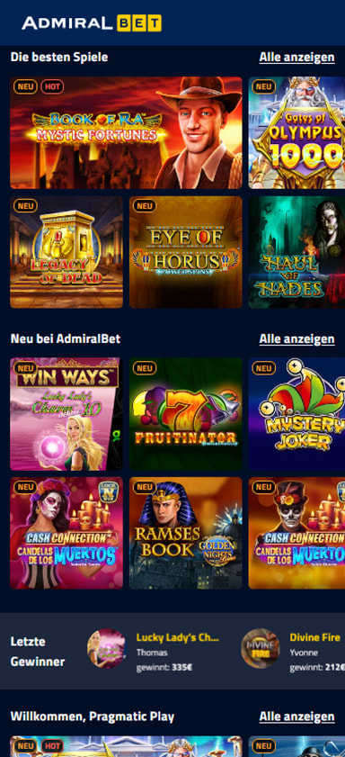 | Casinospiele: 300+ | Bewertet von Christoph Labrenz | Zuletzt aktualisiert 20.11.2025 | Jetzt anmelden Zur AdmiralBet Webseite |