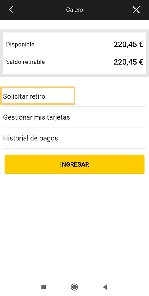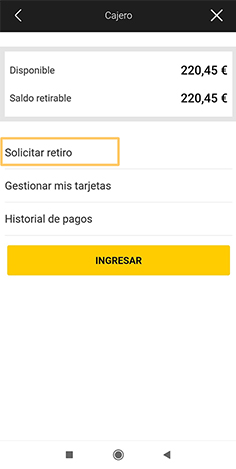 La opción predeterminada suele ser la transferencia bancaria, dado que Bizum no permite retiradas directas. No obstante, te recomendamos elegir alguna opción inmediata si el operador lo permite sin haber depositado previamente con ella. A continuación, te mostramos el proceso paso a paso para retirar en tu casino online elegido.